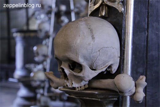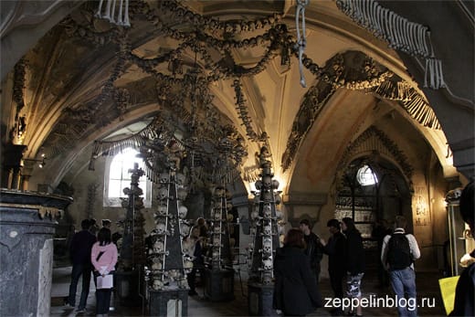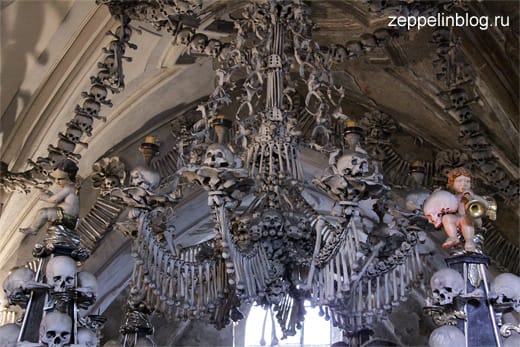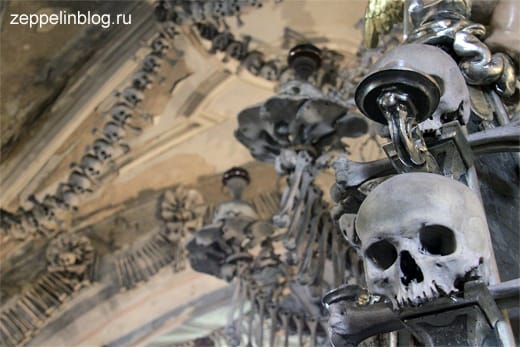 В помещении Костницы находятся пирамиды, обелиски, люстра, гирлянды, гербы… из человеческих останков. На убранство помещения ушло примерно 40 000 человеческих костей. И когда понимаешь, что это не гипс, не высеченный из камня орнамент, первые минуты теряешься.